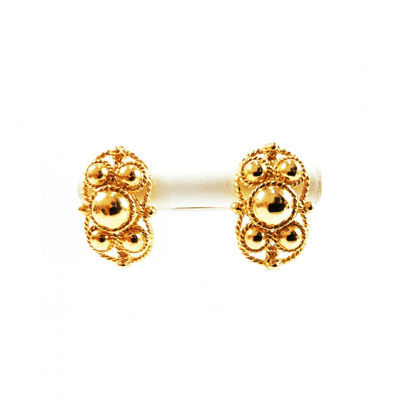 Boucles d'oreilles Boulonnaises "Noeuds d'amour" en or jaune 18 carats, représentant le motif de la bague Boulonnaise. Les boucles d'oreilles Boulonnaises sont composées de 9 boules de tailles différentes représentant les 9 mois de grossesse. Des cordages entourent les boules et forment au revers intérieur de la bague, des curs entrelacés.