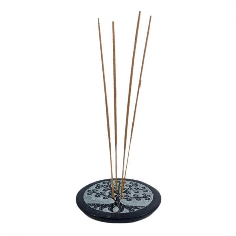 Porte-encens rond ø10cm noir et gris en Pierre à savon - Motif Arbre de vie