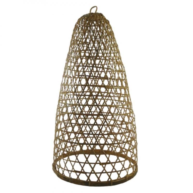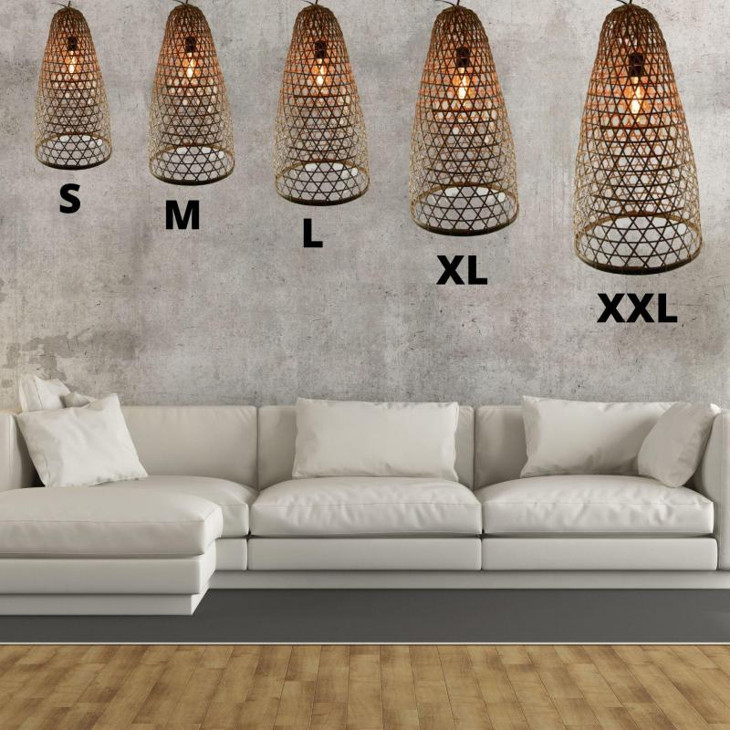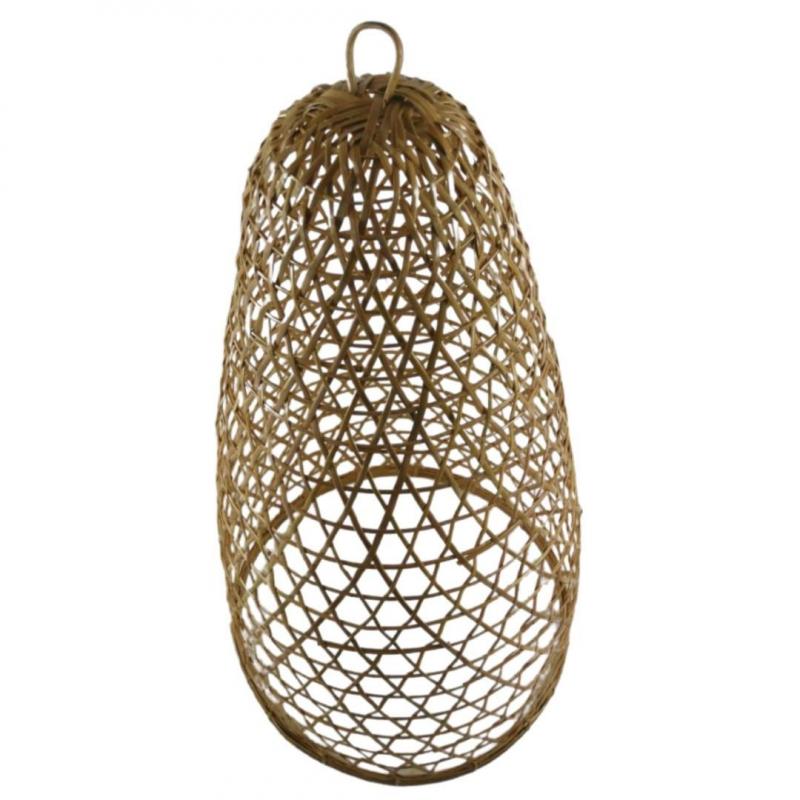 Hauteur totale 43cm x diamètre 23cm environ (peut varier de quelques cm). Matières : vannerie de rotin et de bambou naturels. Suspensions vendue seule, équipement électrique non-inclus. Compatible avec toutes les installations électriques pour plafond.