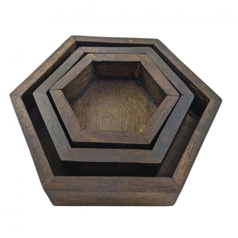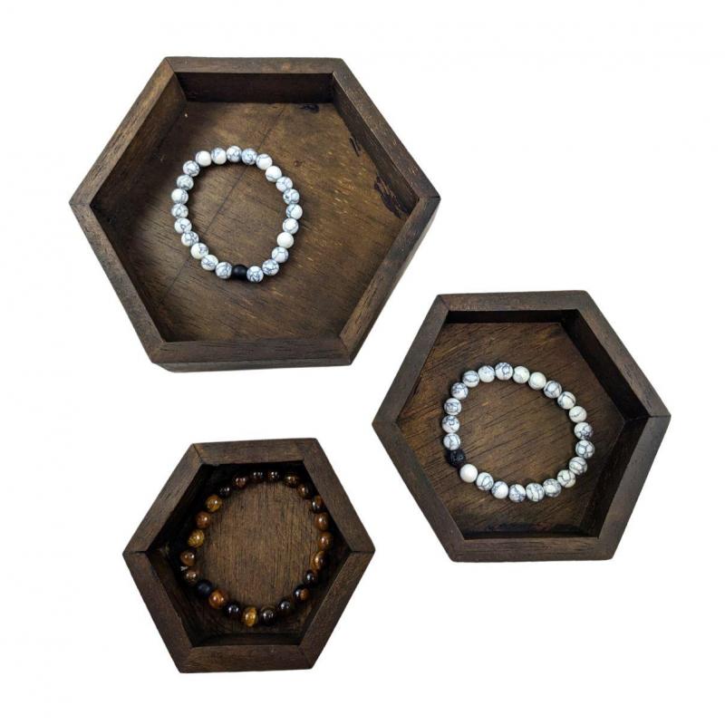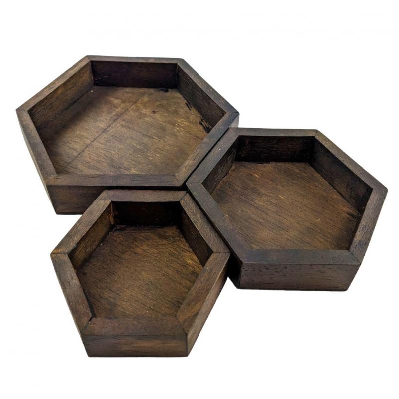 Set de 3 plateaux de présentation pour bijoux - Présentoirs hexagonaux gigognes en bois marron