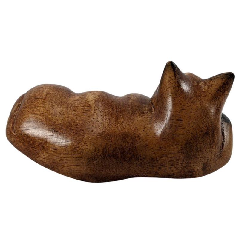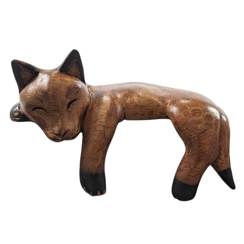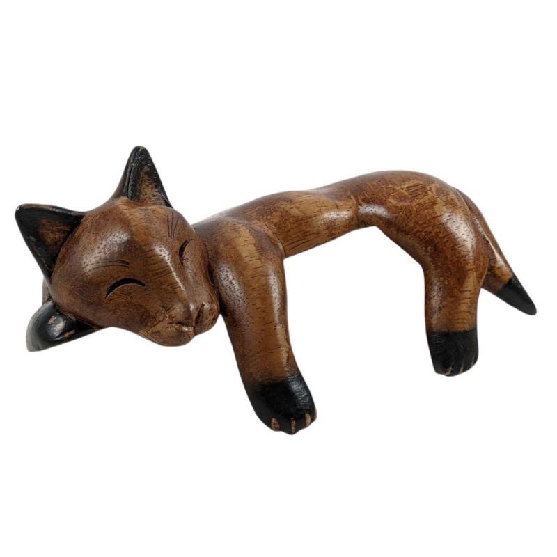 Chat Endormi en Bois 15cm Allongé sur un Rebord d'étagère