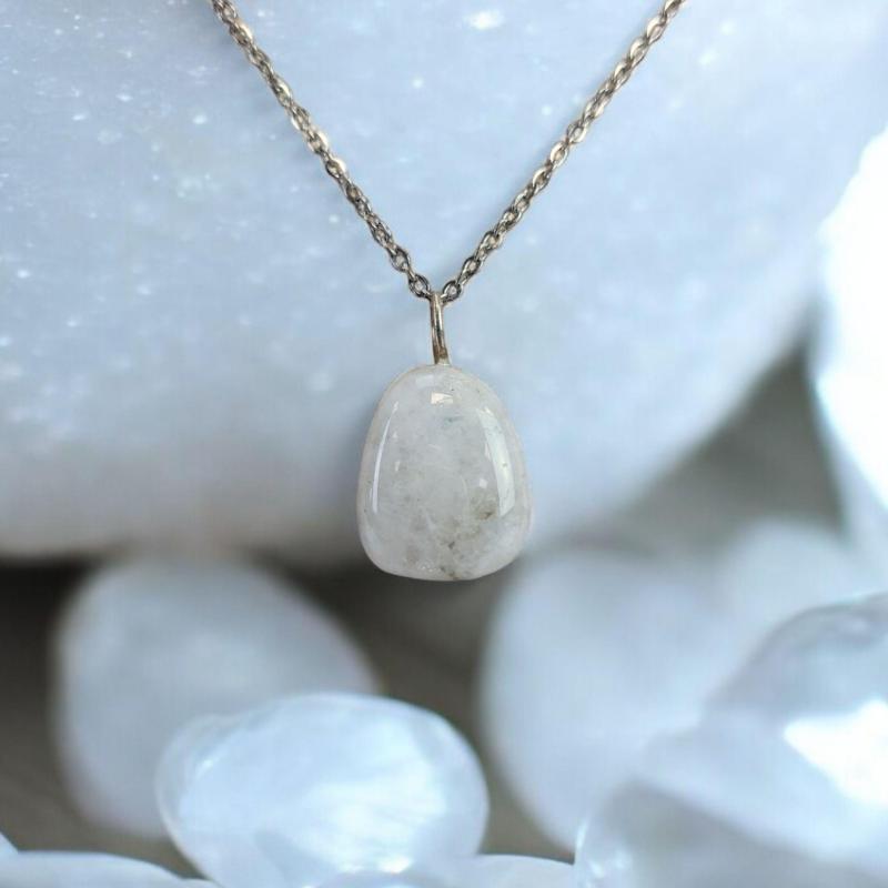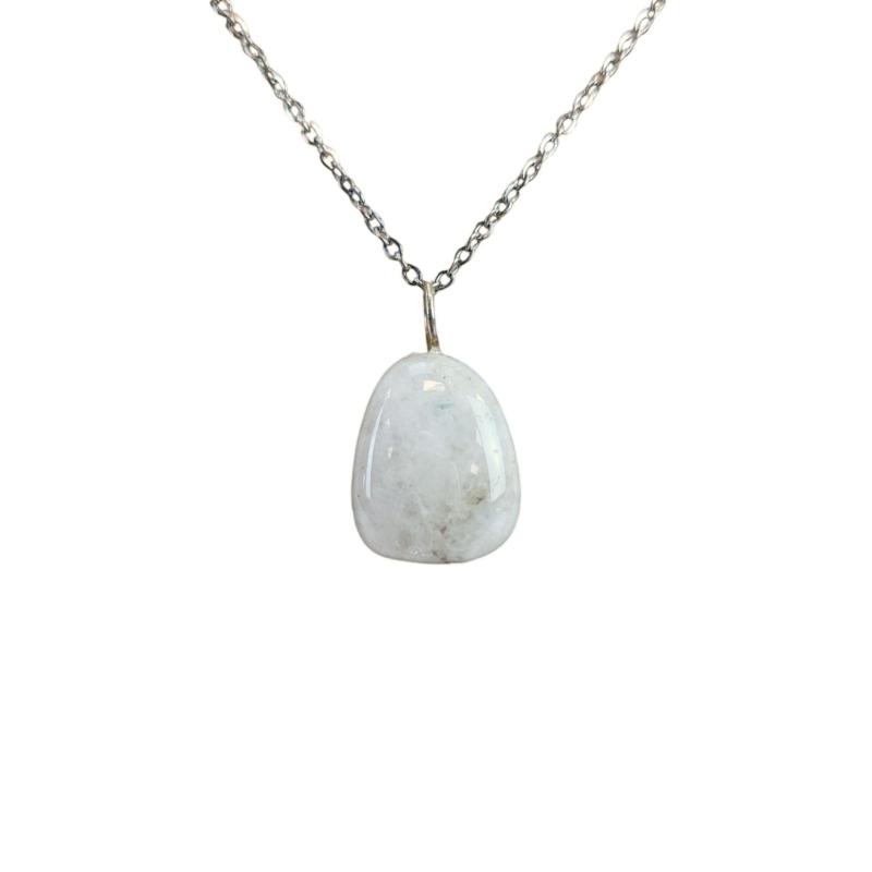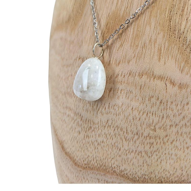Collier Pierre de Lune Blanche AAA | Pendentif pierre roulée + chaîne acier