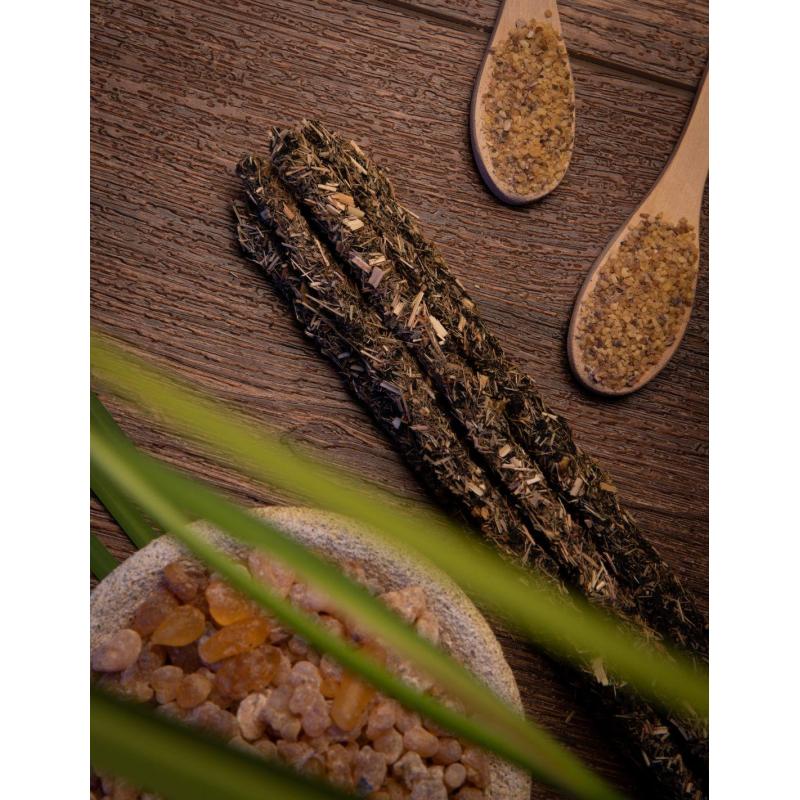 Contenu : 6 gros bâtons d'encens dans leur emballage écologique et recyclable. Temps de combustion de chaque bâton : environ 1 heure. Ingrédients : résine d'oliban, huile concentrée de citronnelle, biomasse de fruits, charbon végétal, liant naturel et sel