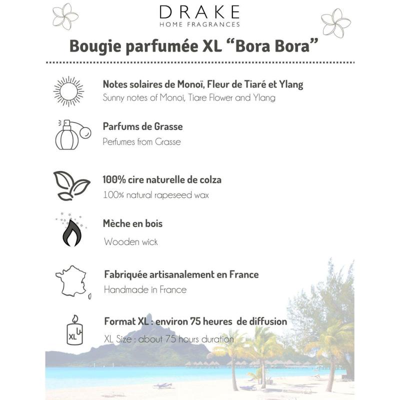 Bougie parfumée naturelle "Bora Bora" Monoï, Tiaré & Ylang 75 heures 500g | Drake